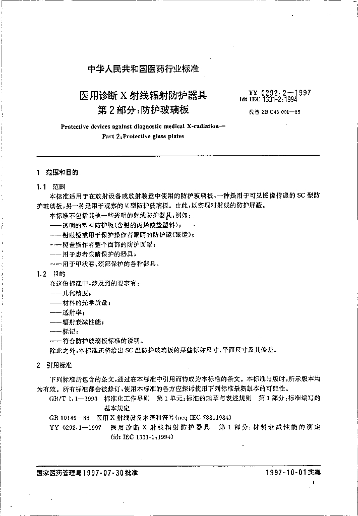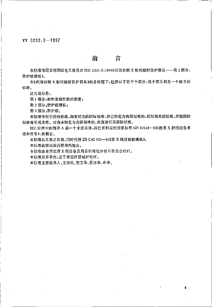 YY 0292.2-1997 医用诊断X射线辐射防护器具 第2部分:防护玻璃板
