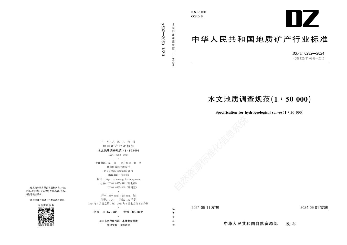 DZ/T 0282-2024 水文地质调查规范(1:50 000)