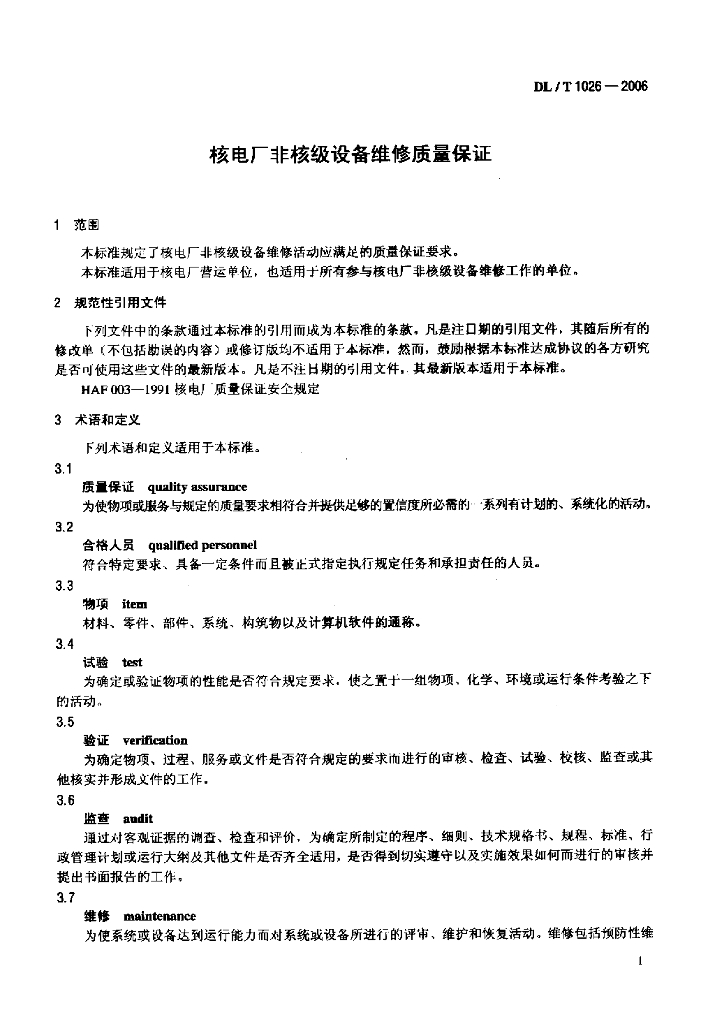DL/T 1026-2006 核电厂非核级设备维修质量保证