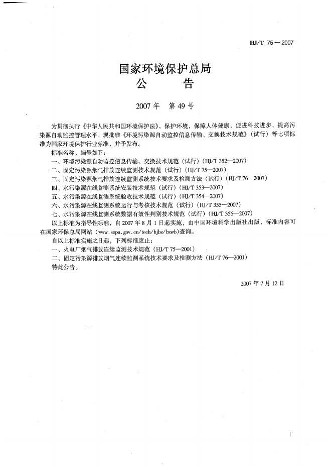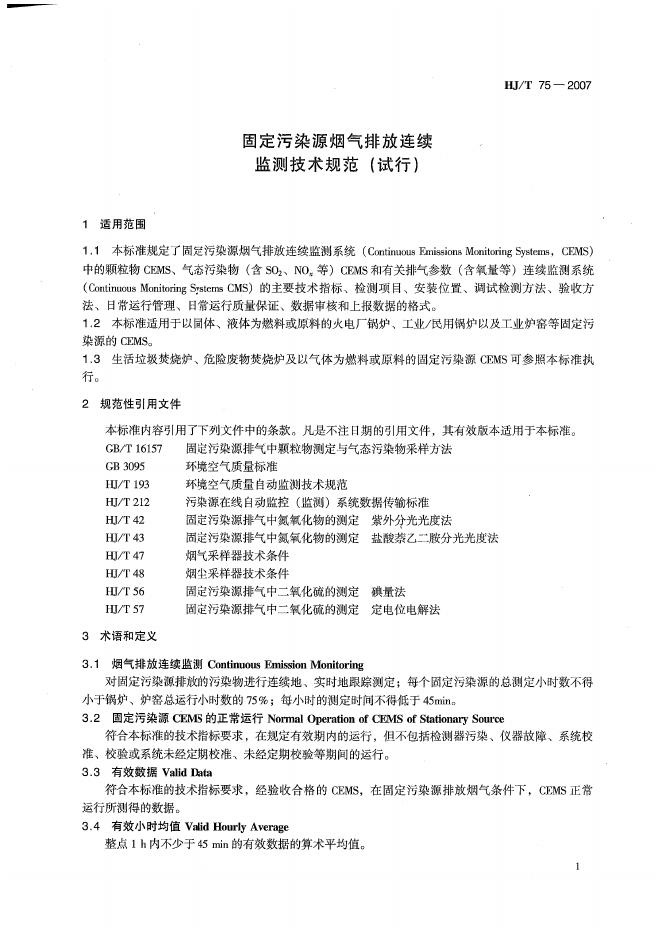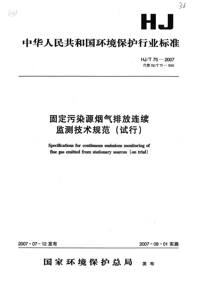 HJ/T 75-2007 固定污染源烟气排放连续监测技术规范(试行)