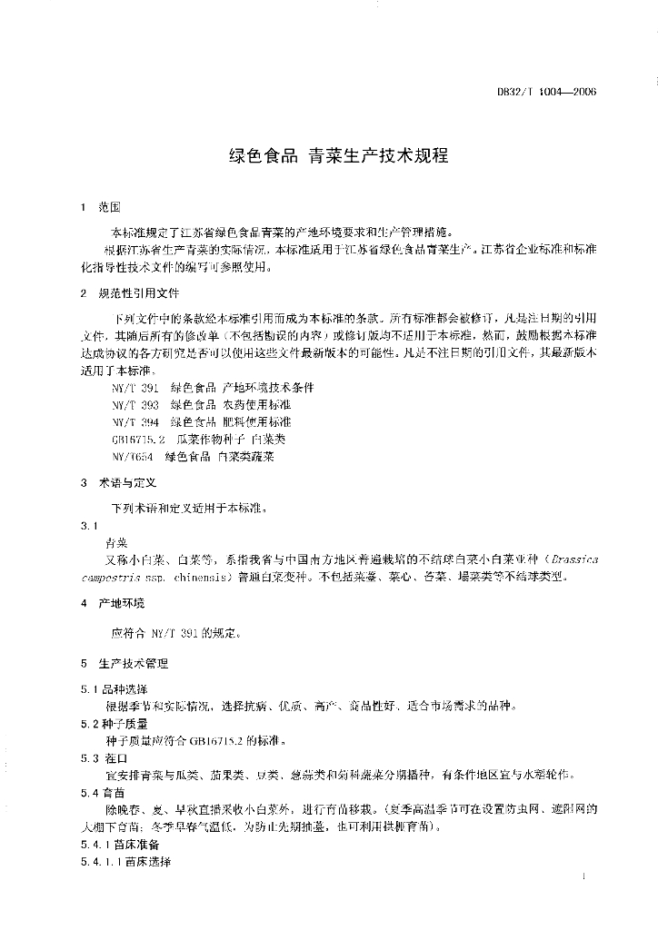 DB32/T 1004-2006 绿色食品 青菜生产技术规程