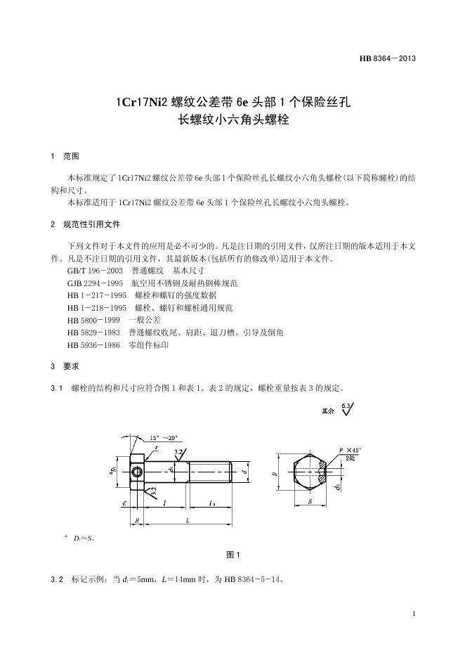 HB 8364-2013(2017) 1CR17Ni2螺纹公差带6E头部1个保险丝孔长螺纹小六角头螺栓