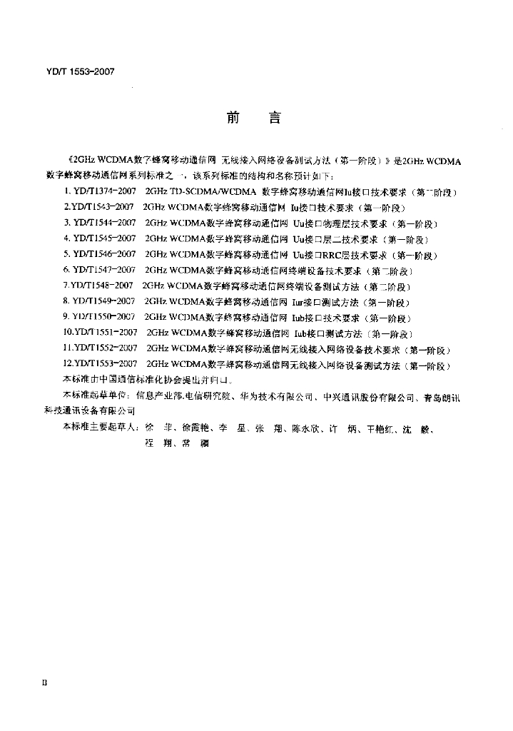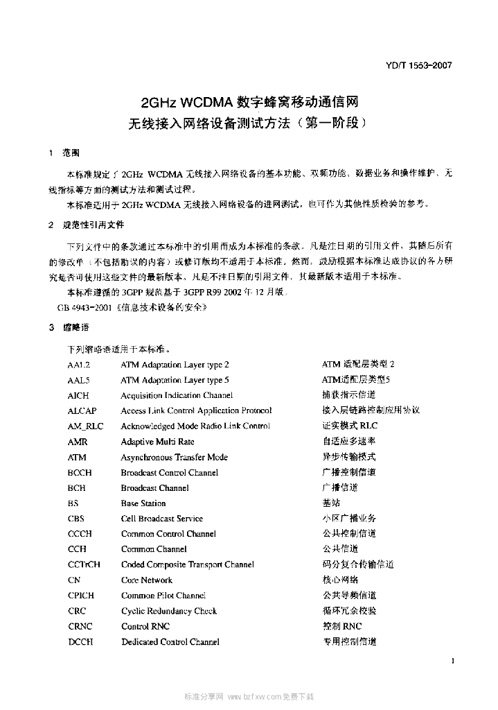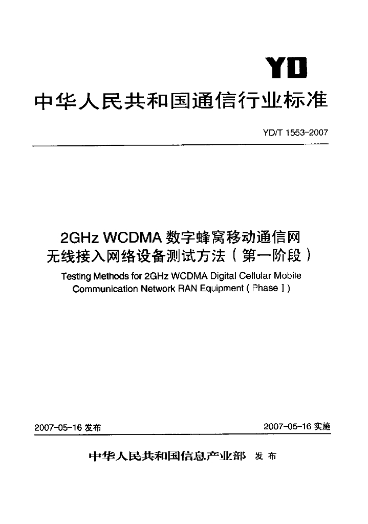 YD/T 1553-2007 2GHz WCDMA 数字蜂窝移动通信网无线接入网络设备测试方法(第一阶段)