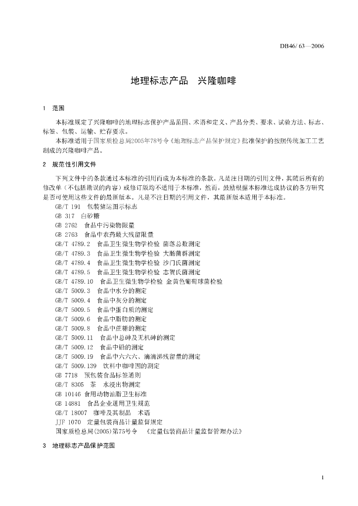 DB46/T 63-2006 地理标志产品 兴隆咖啡