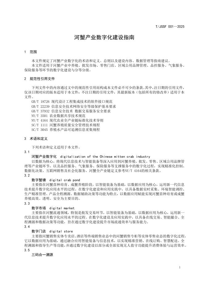 T/JSSF 001-2025 河蟹产业数字化建设指南
