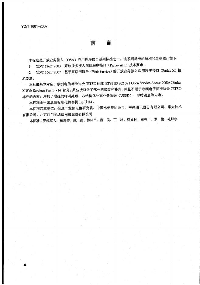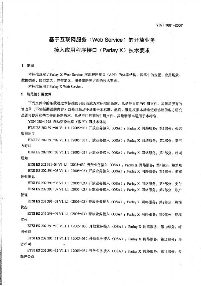 YD/T 1661-2007 基于互联网服务(Web Service)的开放业务接入应用程序接口(Parlay X)技术要求