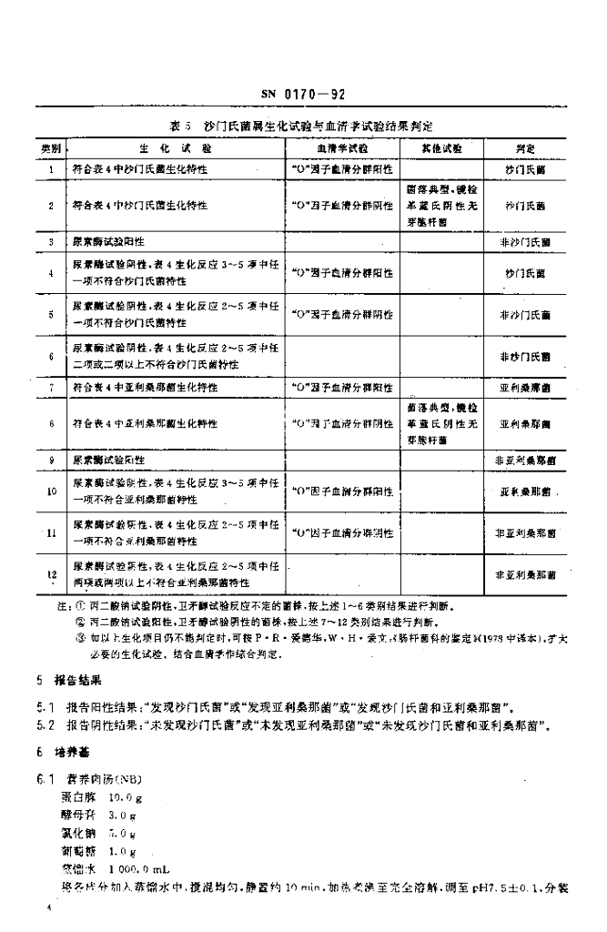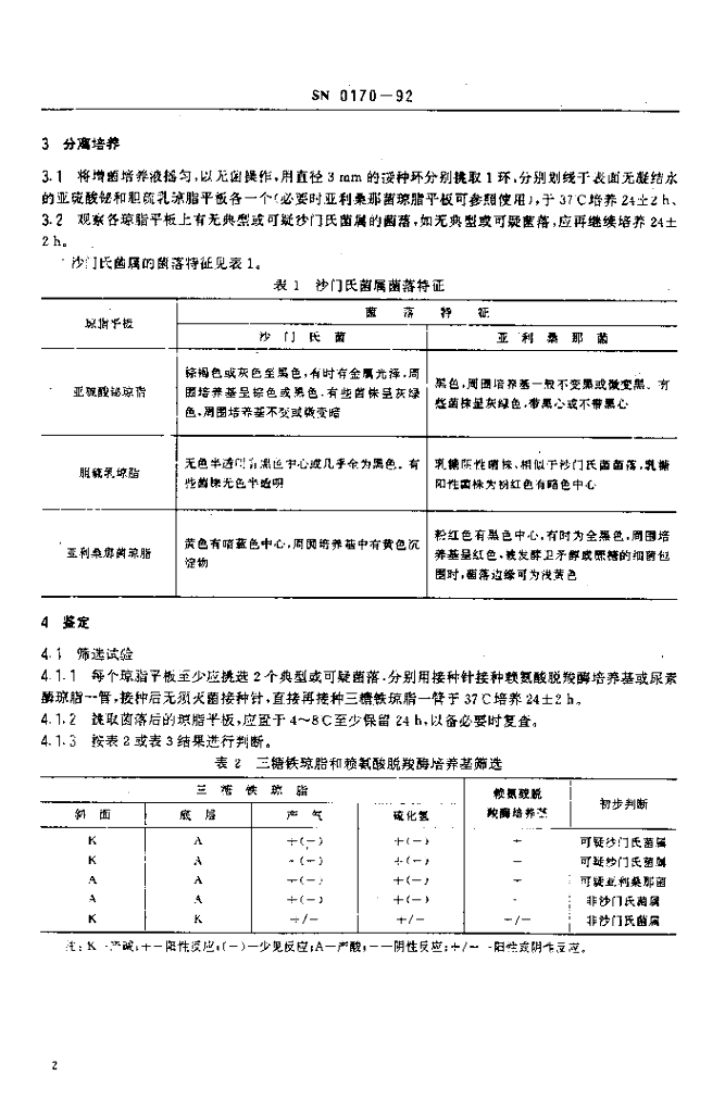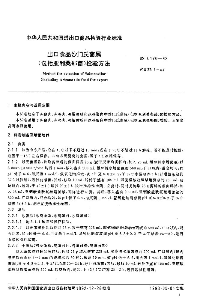 SN 0170-1992 出口食品沙门氏菌属(包括亚利桑那菌)检验方法
