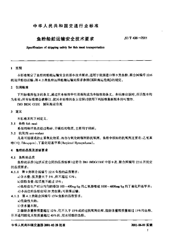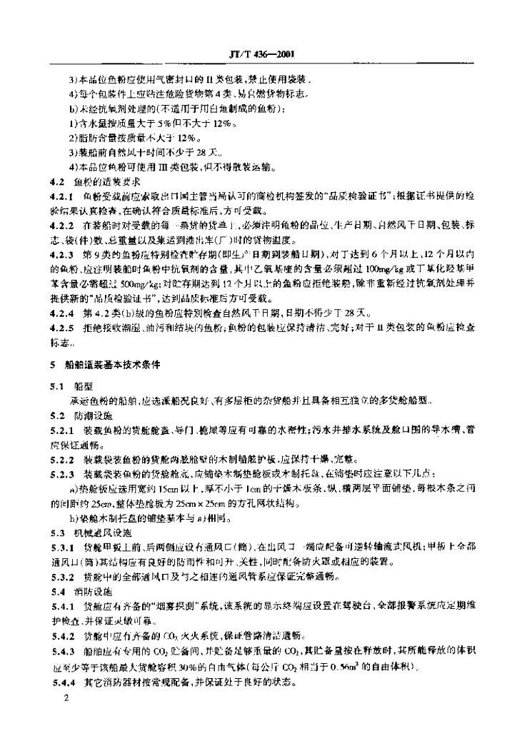 JT/T 436-2001 鱼粉船舶运输安全技术要求