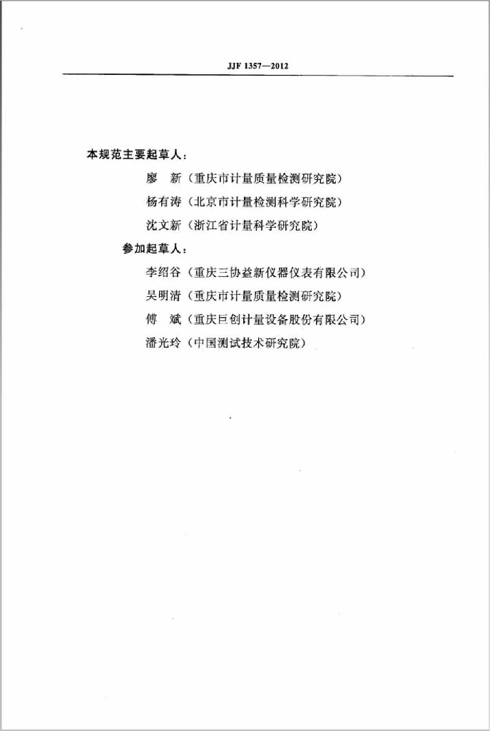 廖新(重庆市计量质量检测研究院)、杨有涛(北京市计量检测科学研究院)、沈文新(浙江省计量科学研究院)、李绍谷(重庆三协益新仪器仪表有限公司)、昊明清(重庆市计量质量检测研究院)、傅斌(重庆巨创计量设备股份有限公司)、潘光玲(中国测试技术研究院)