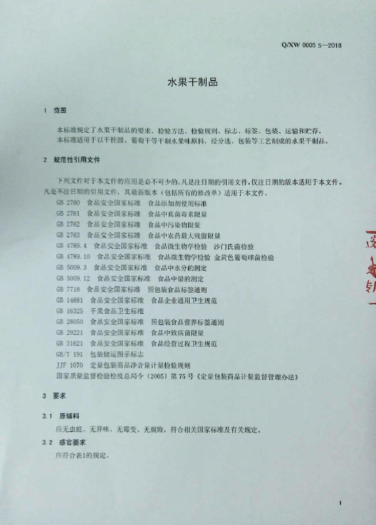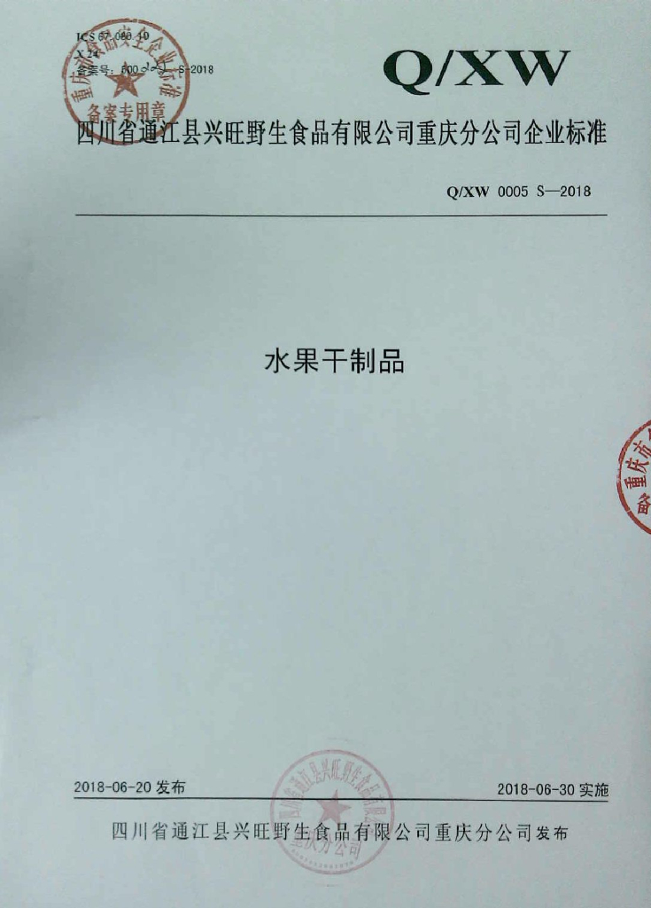 Q/XW 0005S-2018 水果干制品
