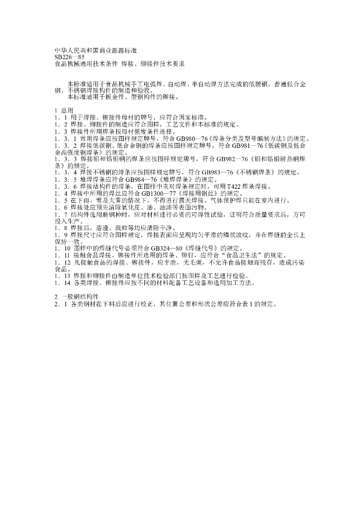 SB 226-1985 食品机械通用技术条件 焊接、铆接件技术要求