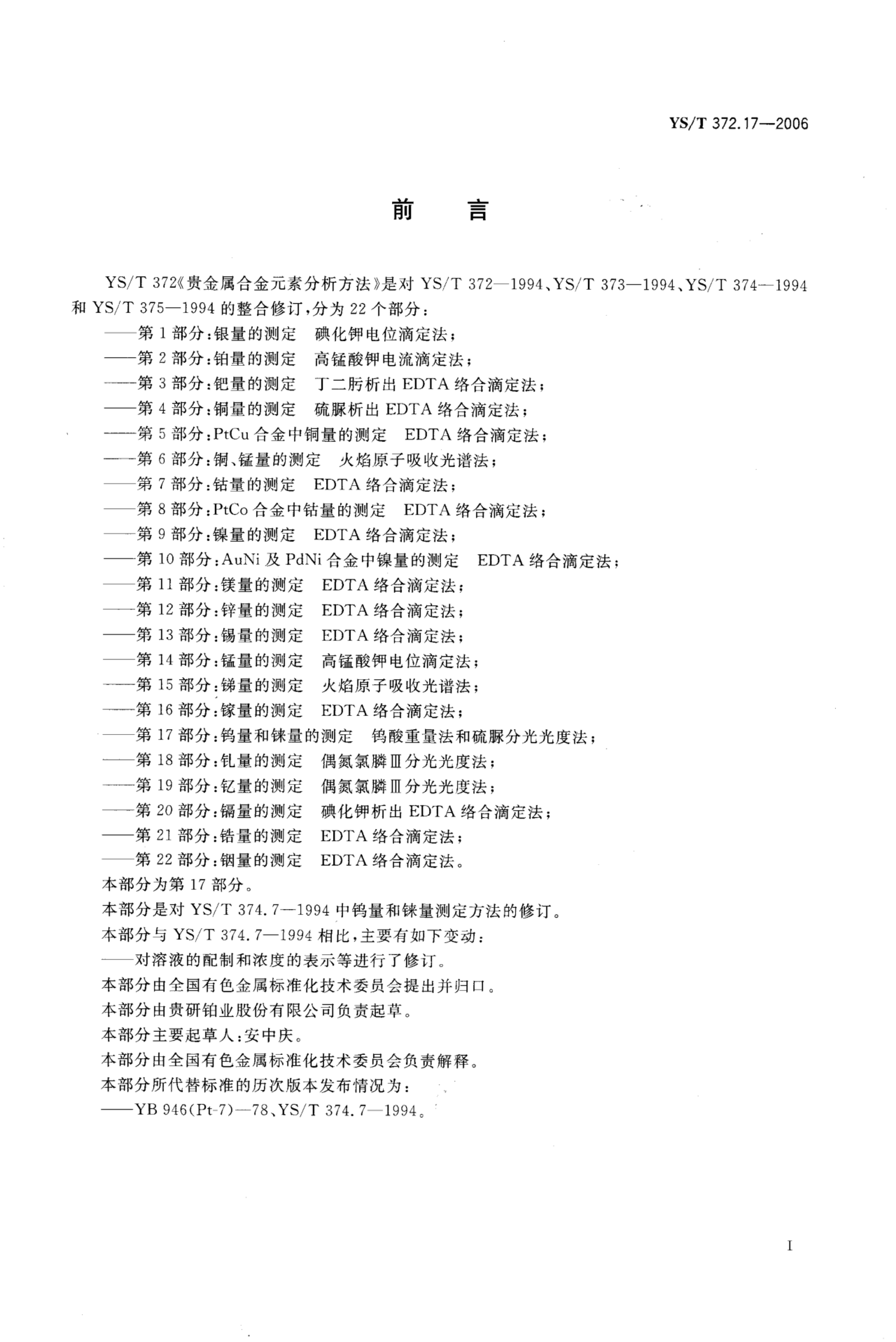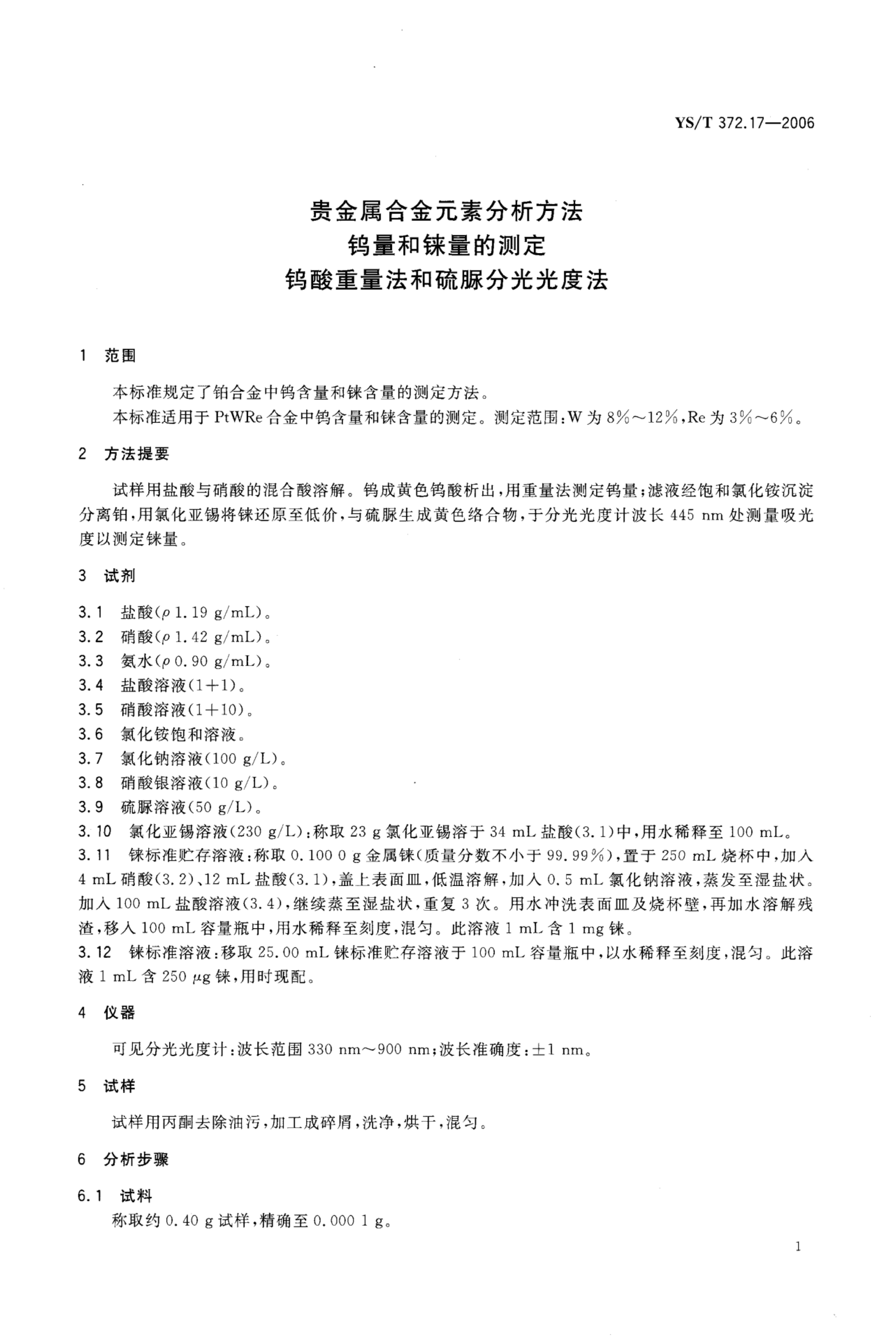 YS/T 372.17-2006 贵金属合金元素分析方法 钨量和铼量的测定钨酸重量法和硫脲分光光度法