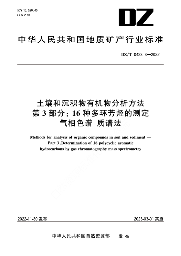 DZ/T 0423.3-2022 土壤和沉积物有机物分析方法 第3部分:16种多环芳烃的测定 气相色谱-质谱法
