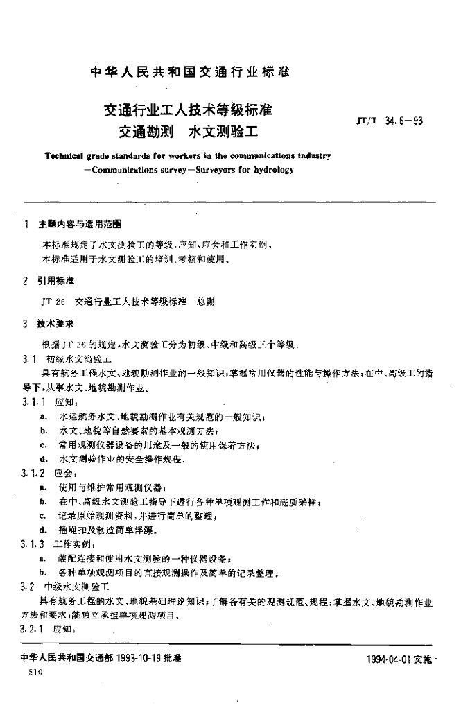 JT/T 34.6-1993 交通行业工人技术等级标准交通勘测水文测验工