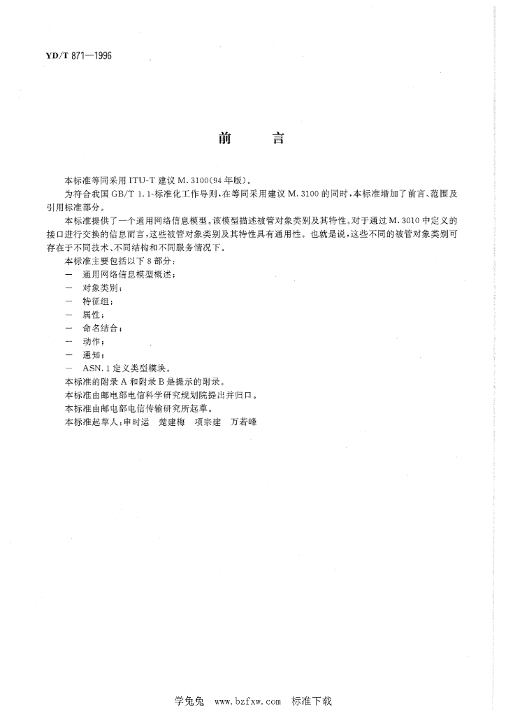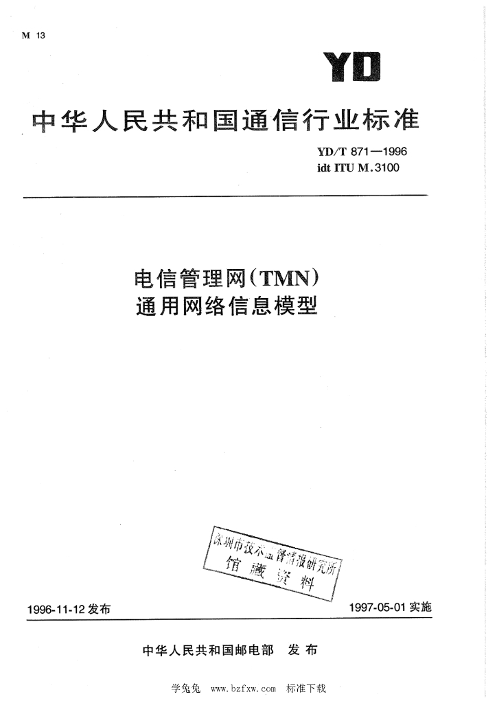 YD/T 871-1996 电信管理网(TMN)通用网络信息模型