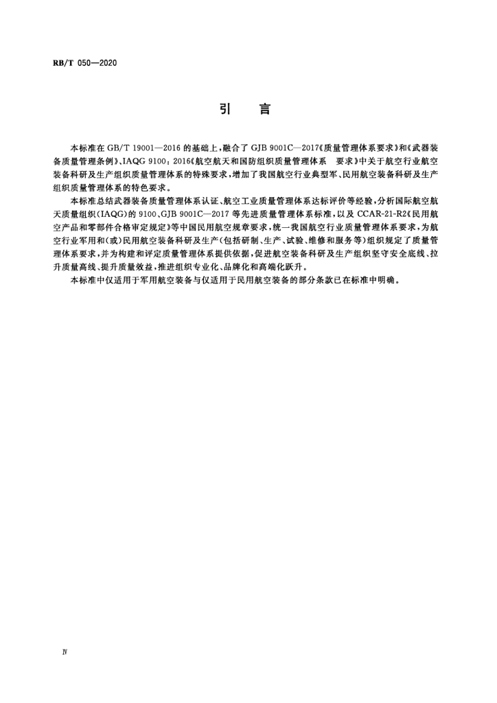RB/T 050-2020 航空行业 航空装备科研及生产组织质量管理体系 要求