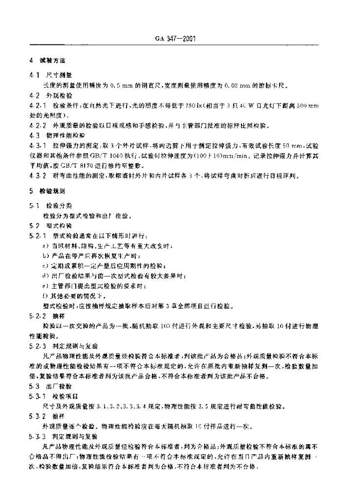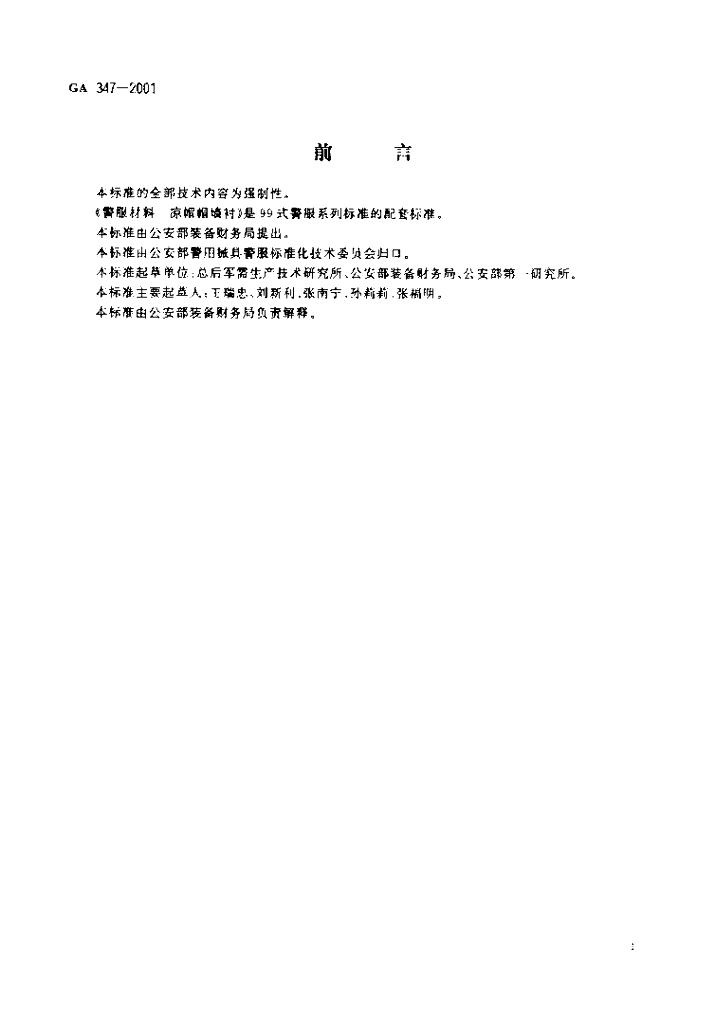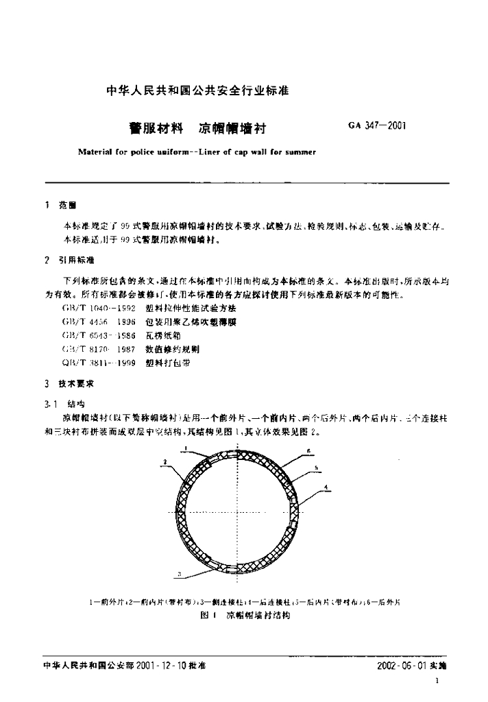 GA 347-2001 警服材料凉帽帽墙衬