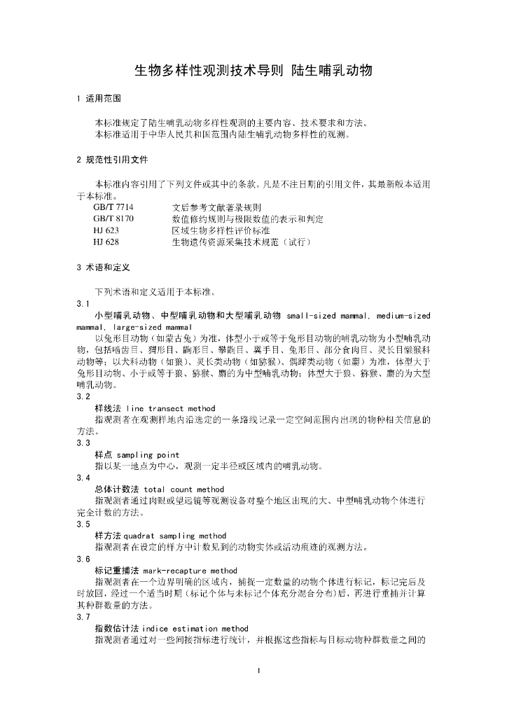 HJ 710.3-2014 生物多样性观测技术导则 陆生哺乳动物