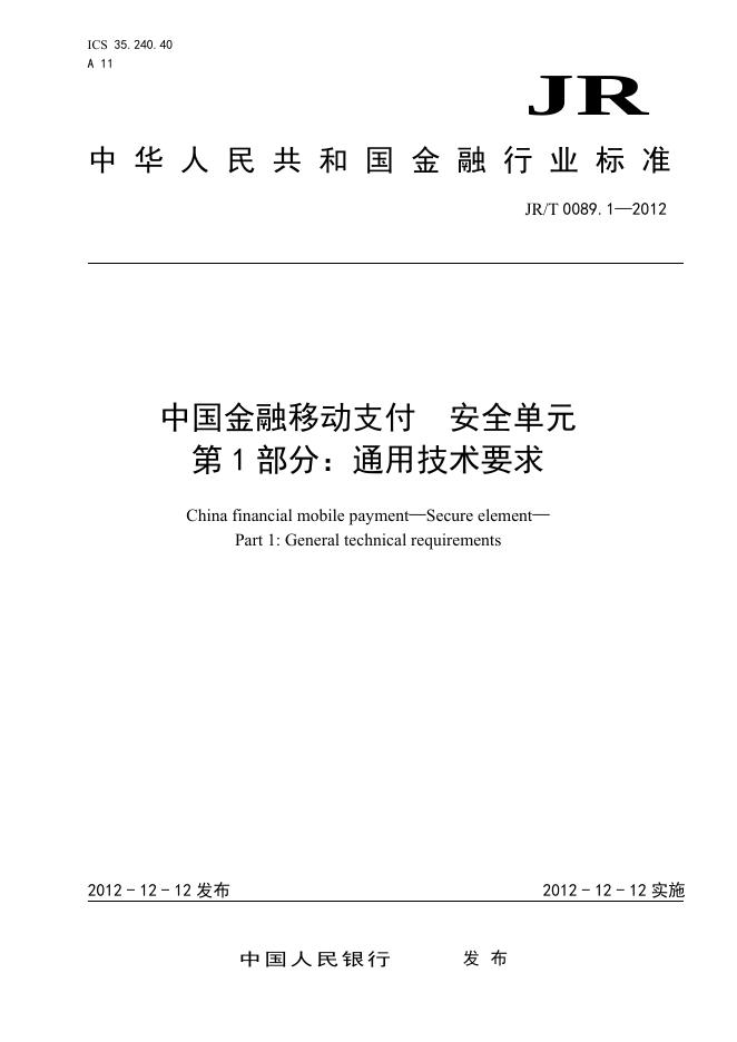 JR/T 0089.1-2012 中国金融移动支付 安全单元 第1部分:通用技术要求