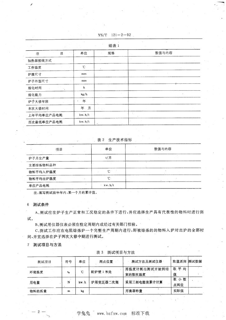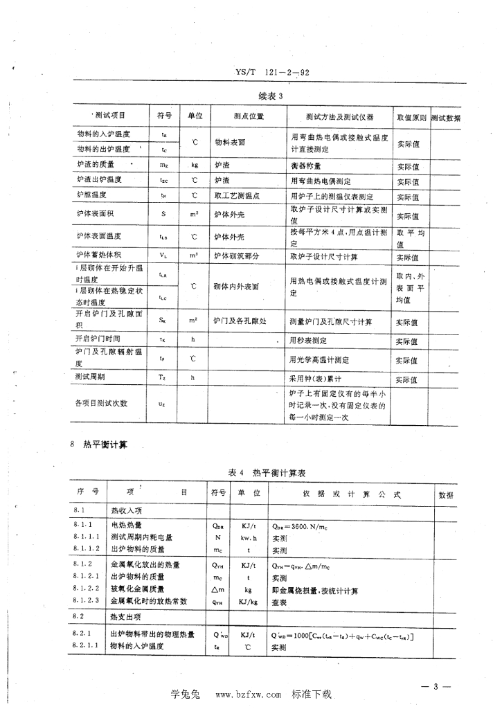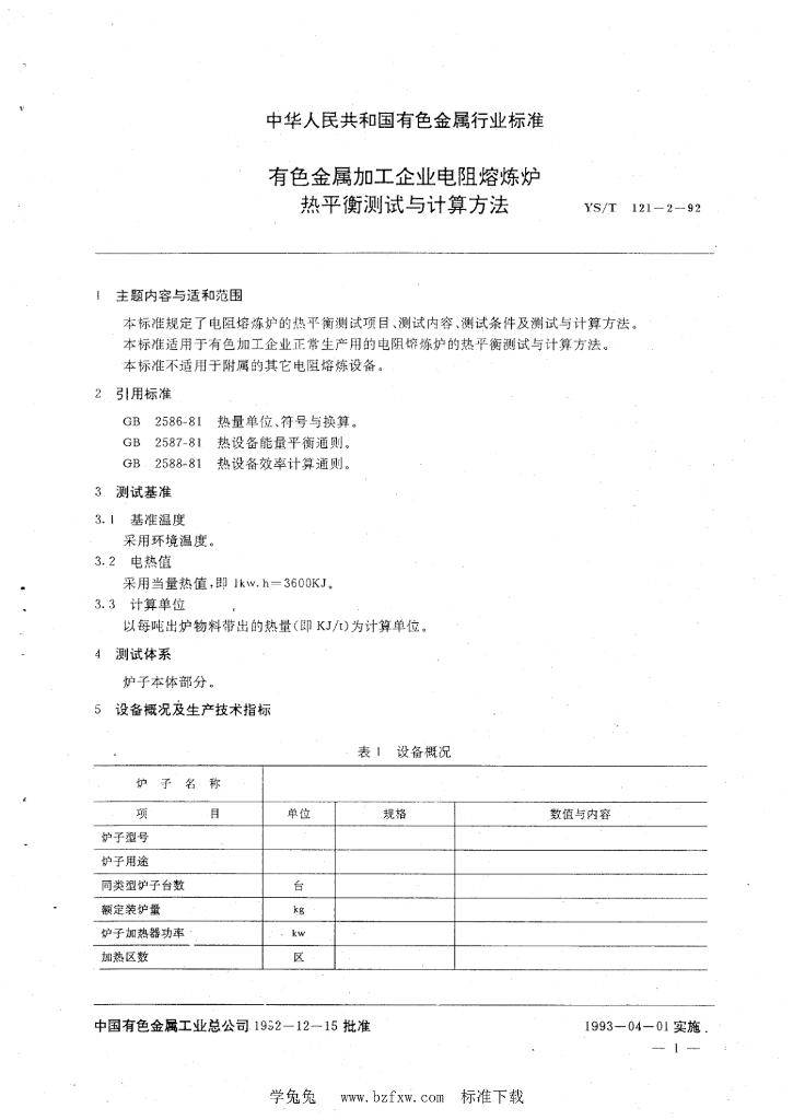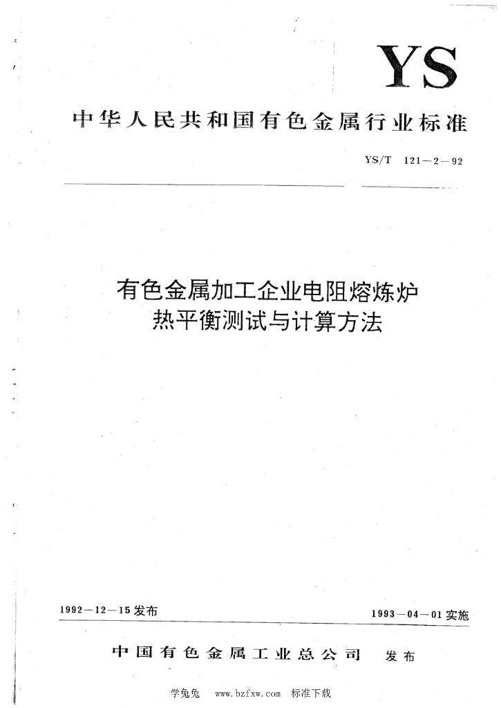 YS/T 121.2-1992 有色金属加工企业电阻熔炼炉热平衡测试与计算方法