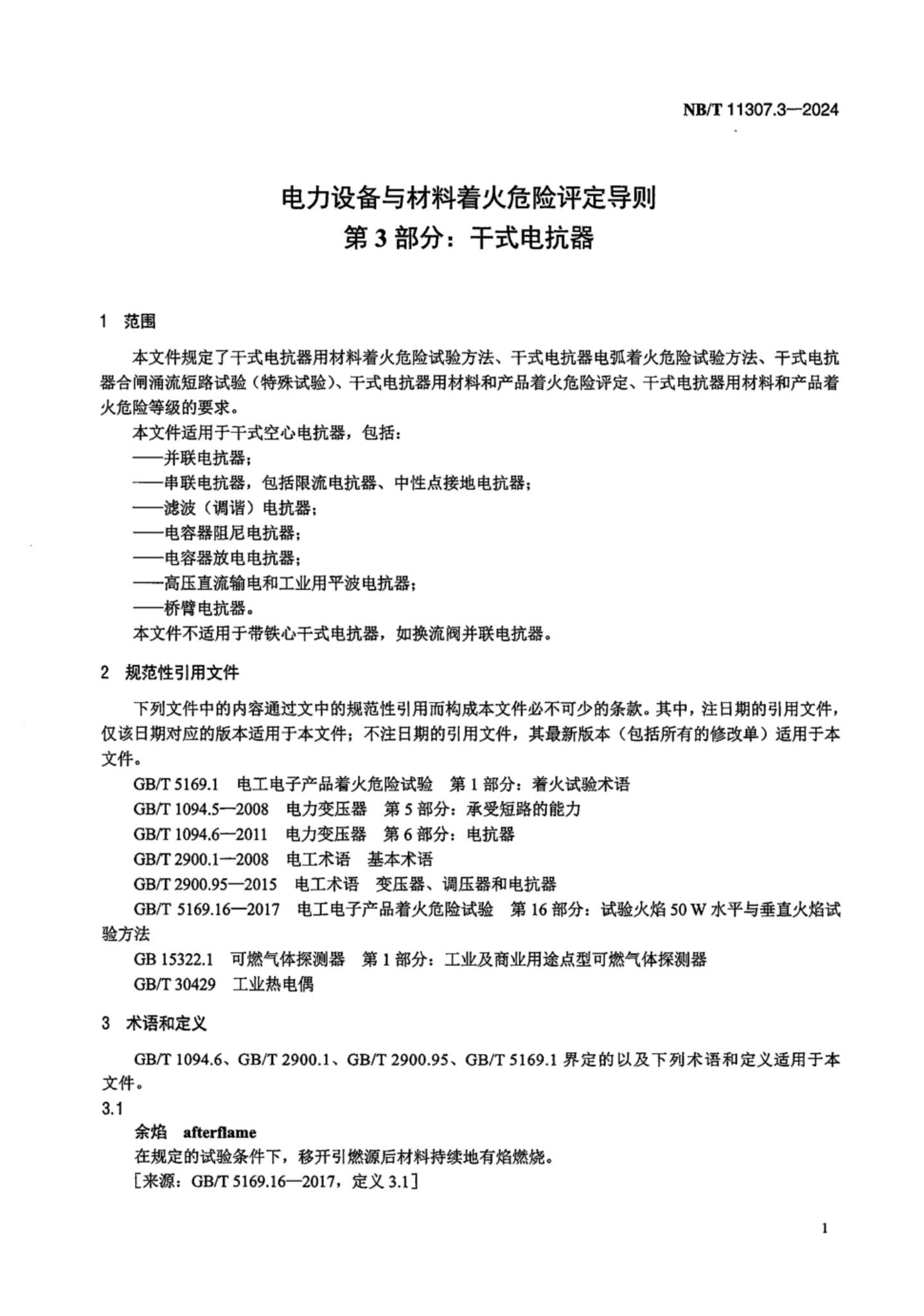 NB/T 11307.3-2024 电力设备与材料着火危险评定导则 第3部分:干式电抗器