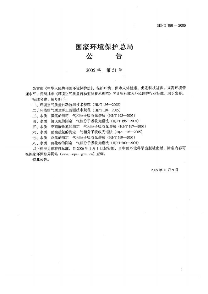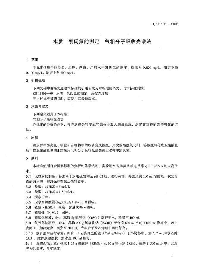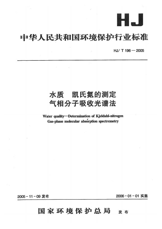 HJ/T 196-2005 水质 凯氏氮的测定 气相分子吸收光谱