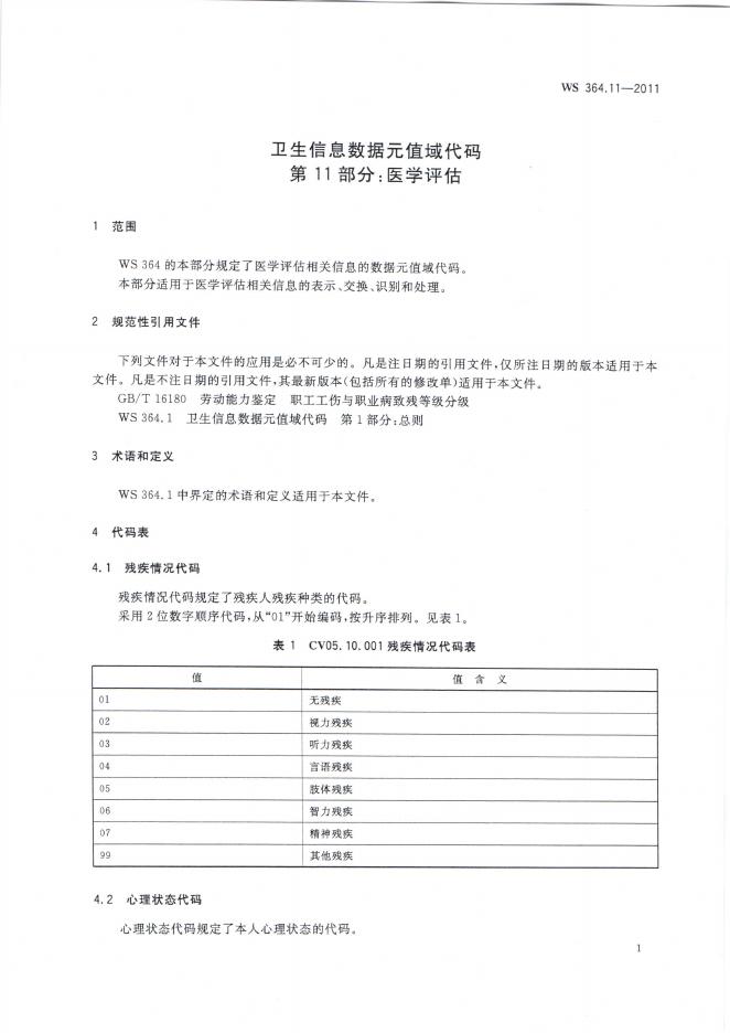 WS 364.11-2011 卫生信息数据元值域代码 第11部分:医学评估
