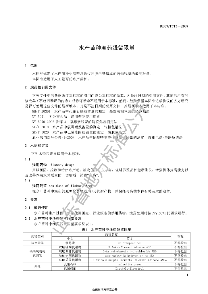 DB37/T 713-2007 水产苗种渔药残留限量