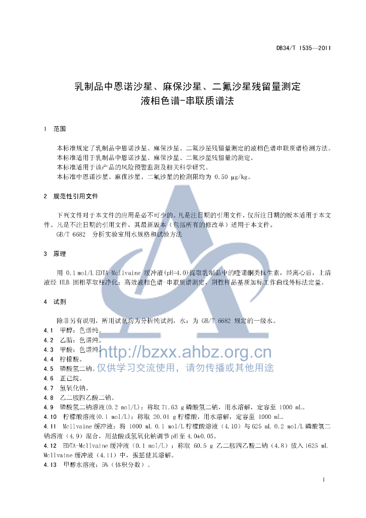 DB34/T 1535-2011 乳制品中恩诺沙星、麻保沙星、二氟沙星残留量测定 液相色谱-串联质谱法