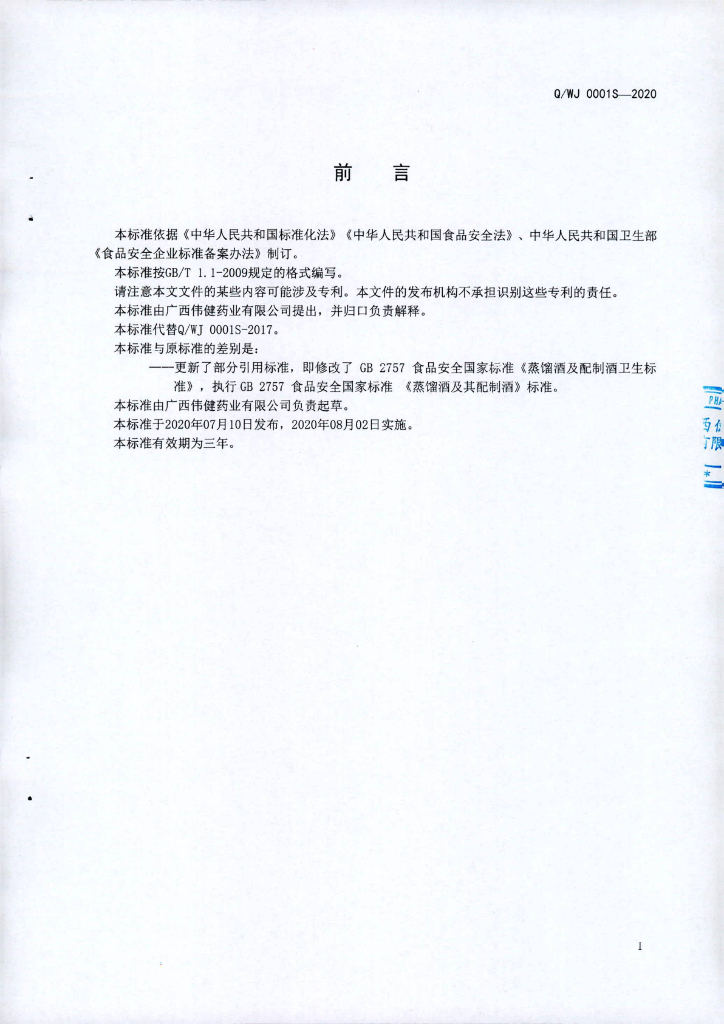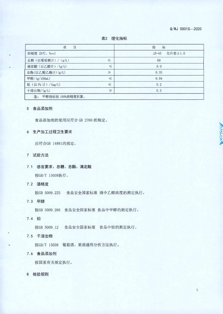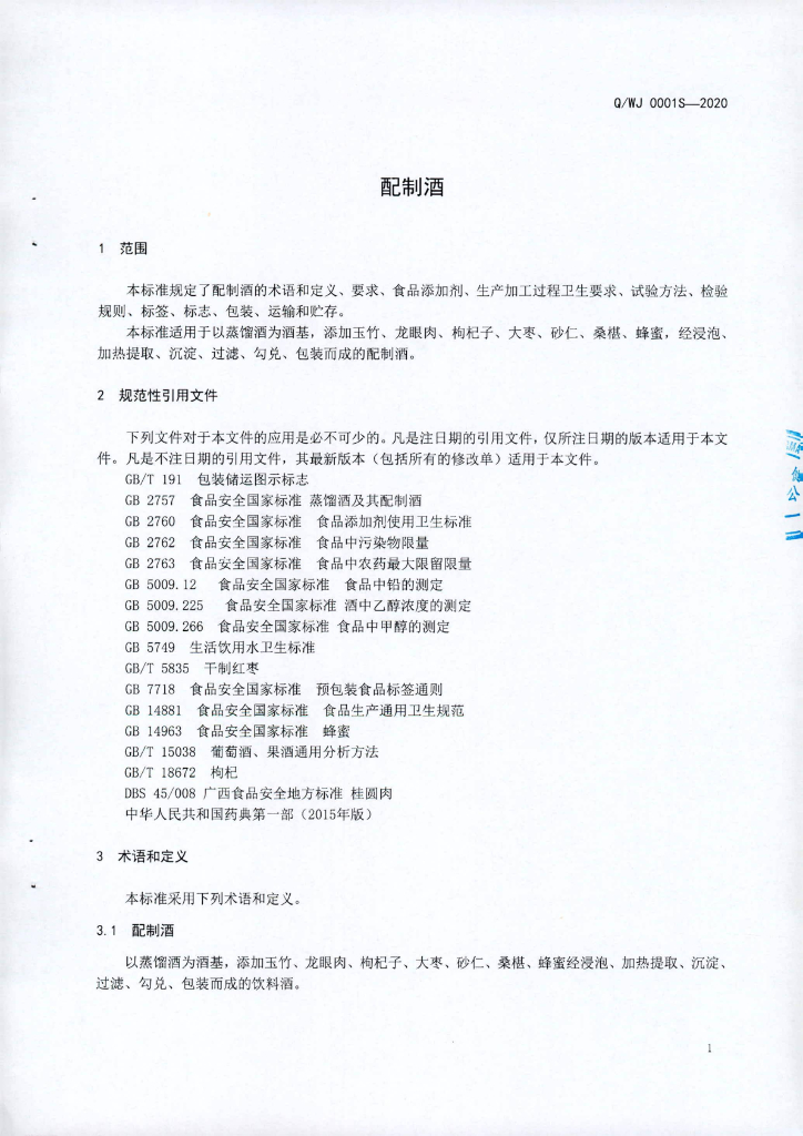 Q/WJ 0001S-2020 配制酒