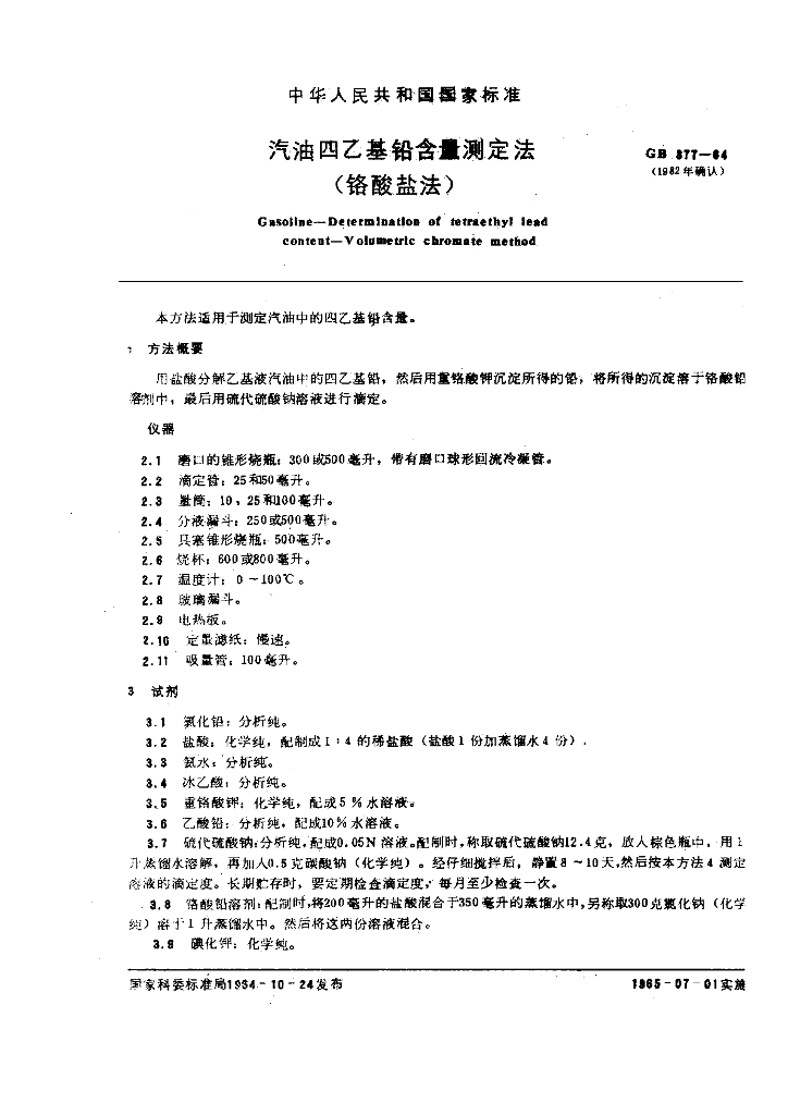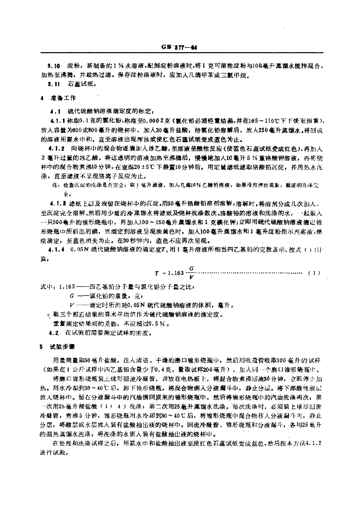 GB/T 377-1964 汽油四乙基铅含量测定法 (铬酸盐法)