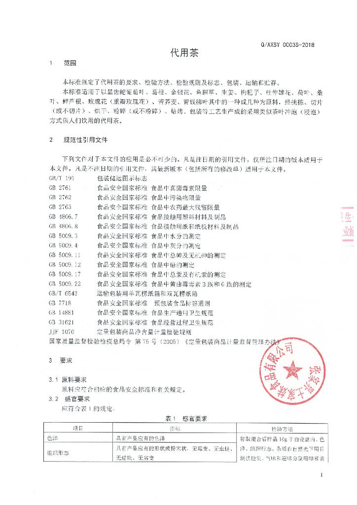 Q/ZYTJ 0001S-2019 代用茶