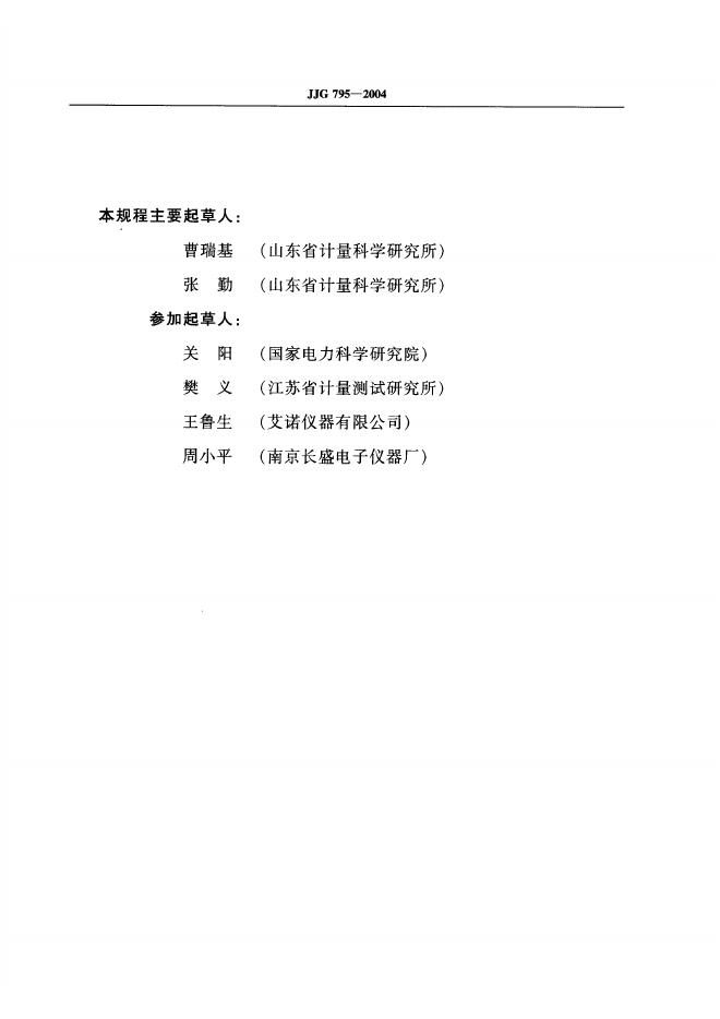曹瑞基(山东省计量科学研究所)、张勤(山东省计量科学研究所)、关阳(国家电力科学研究院)、樊义(江苏省计量测试研究所)、王鲁生(艾诺仪器有限公司)、周小平(南京长盛电子仪器厂)