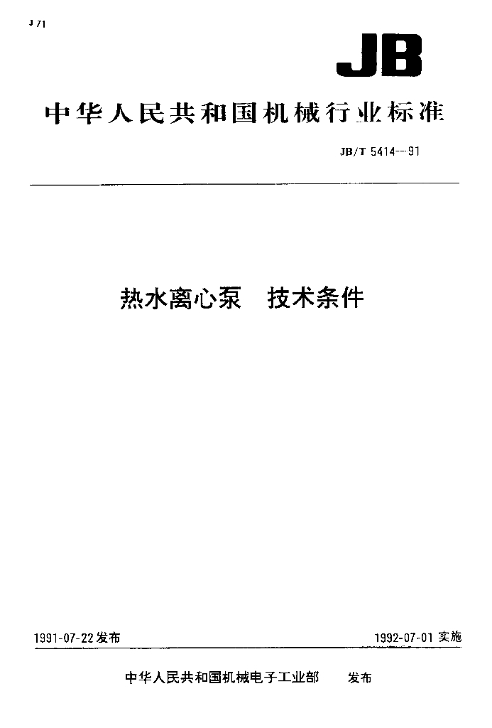 JB/T 5414-1991 热水离心泵 技术条件