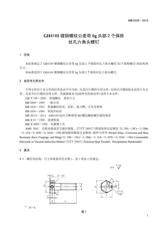 HB 8339-2015 GH4169 镀铜螺纹公差带6G头部2 个保险丝孔六角头螺钉(2017)