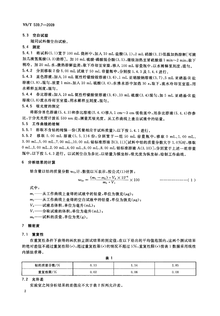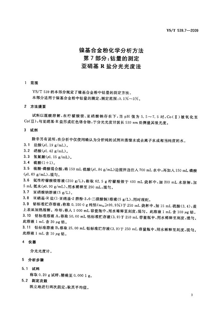 YS/T 539.7-2009 镍基合金粉化学分析方法 第7部分:钴量的测定亚硝基R盐分光光度法
