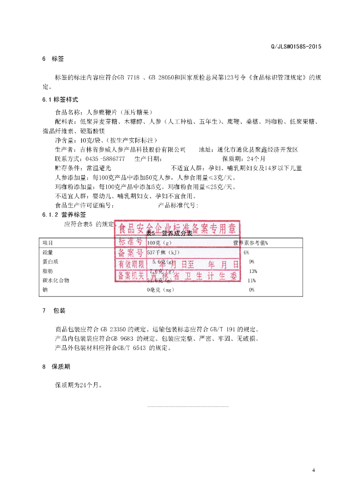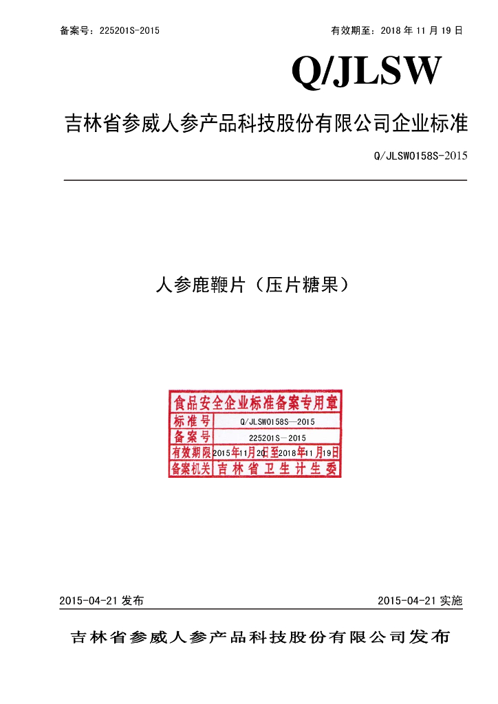 Q/JLSW 0158S-2015 吉林省参威人参产品科技股份有限公司 人参鹿鞭片(压片糖果)