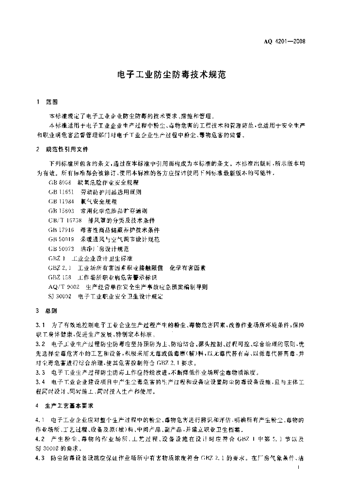 AQ 4201-2008 电子工业防尘防毒技术规范