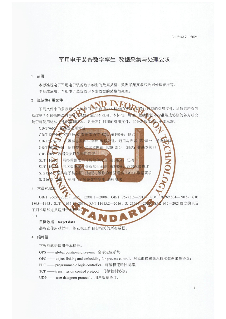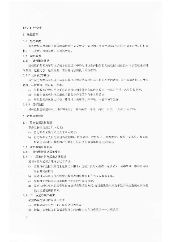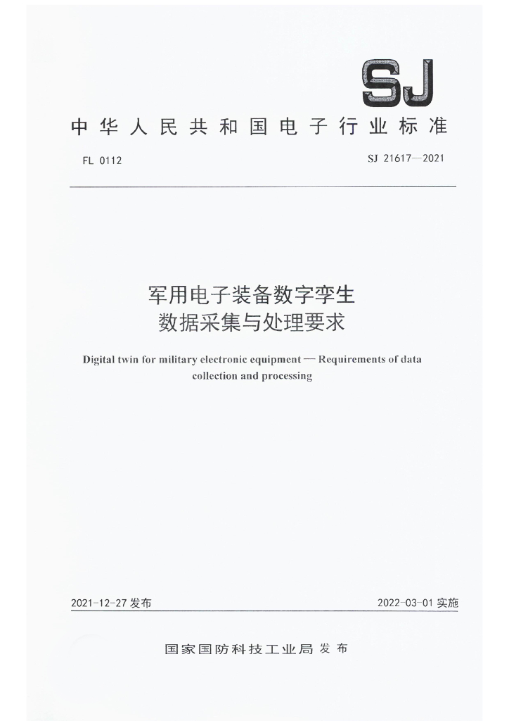 SJ 21617-2021 军用电子装备数字孪生 数据采集与处理要求