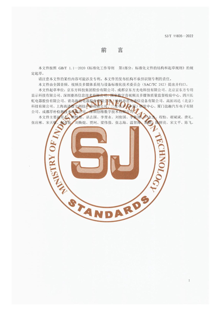 京东方科技集团股份有限公司、成都京东方光电科技有限公司、北京京东方专用显示科技有限公司、深圳赛西信息技术有限公司、国家数字音视频及多媒体质量监督检验中心、四川长虹电器股份有限公司、青岛海信电器股份有限公司、桂林市思奇通信设备有限公司、高拓讯达(北京)科技有限公司、上海高清数字科技产业有限公司、三星电子(中国)研发中心、厦门盈趣汽车电子有限公司、成都厚朴检测技术有限公司、深圳创维数字技术有限公司