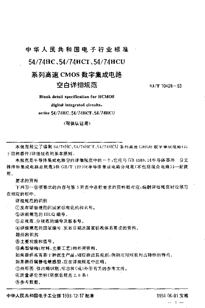 SJ/T 10428-1993 54/74HC、54/74HCT、54/74HCU系列高速CMOS数字集成电路空白详细规范