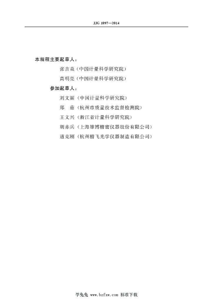 张吉众(中国计量科学研究院)、高明亮(中国计量科学研究院)、刘文丽(中国计量科学研究院)、郑茹(杭州市质量技术监督检测院)、王文兴(浙江省计量科学研究院)、胡赤兵(上海雄博精密仪器股份有限公司)、道克刚(杭州精飞光学仪器制造有限公司)