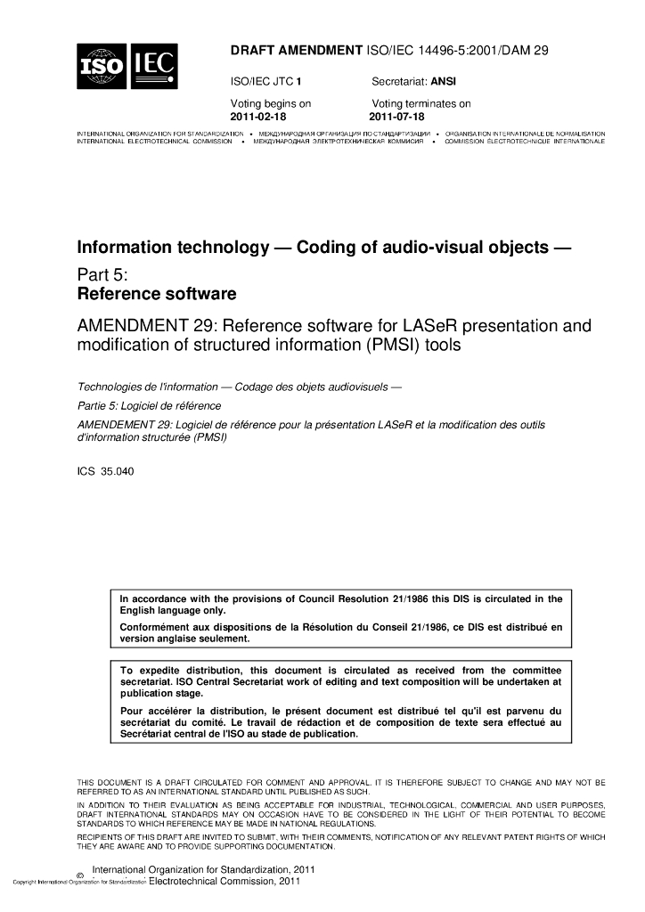ISO/IEC 14496-5-2001/Amd 29-2011 结构化信息工具的LASeR声明和修改用参考软件