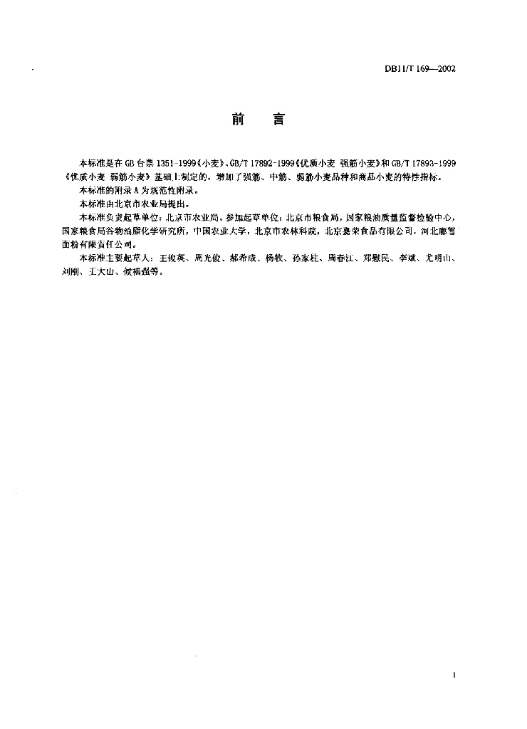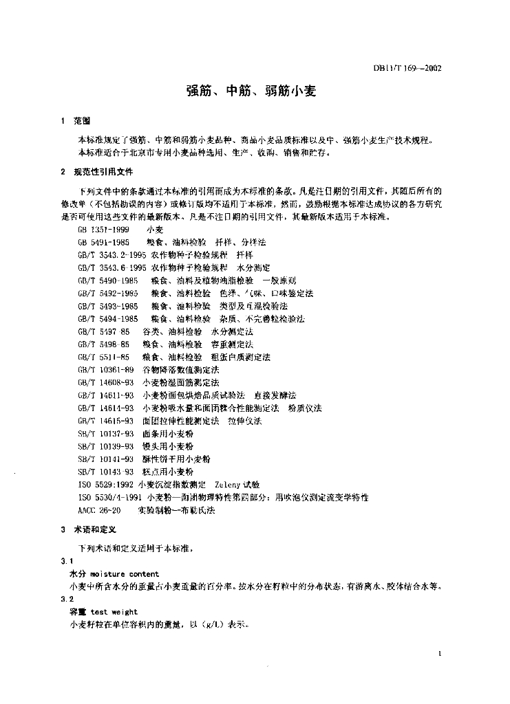 DB11/T 169-2002 强筋、中筋、弱筋小麦