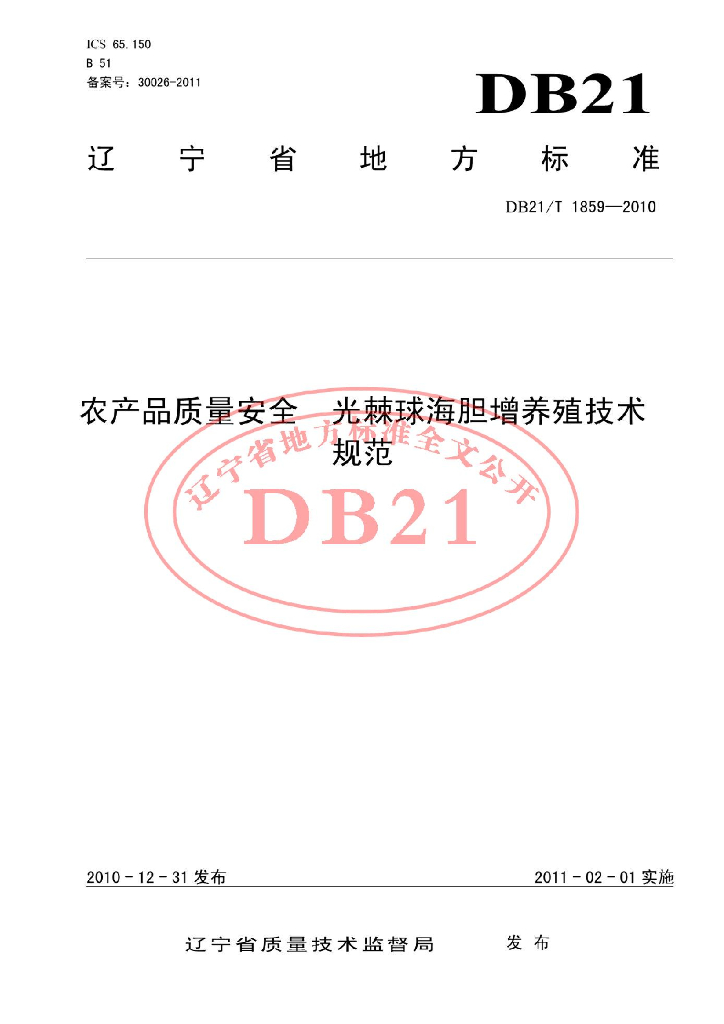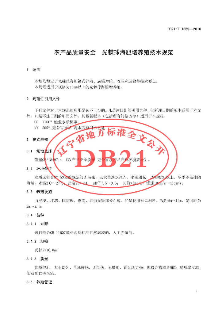 DB21/T 1859-2010 农产品质量安全 光棘球海胆增养殖技术规范