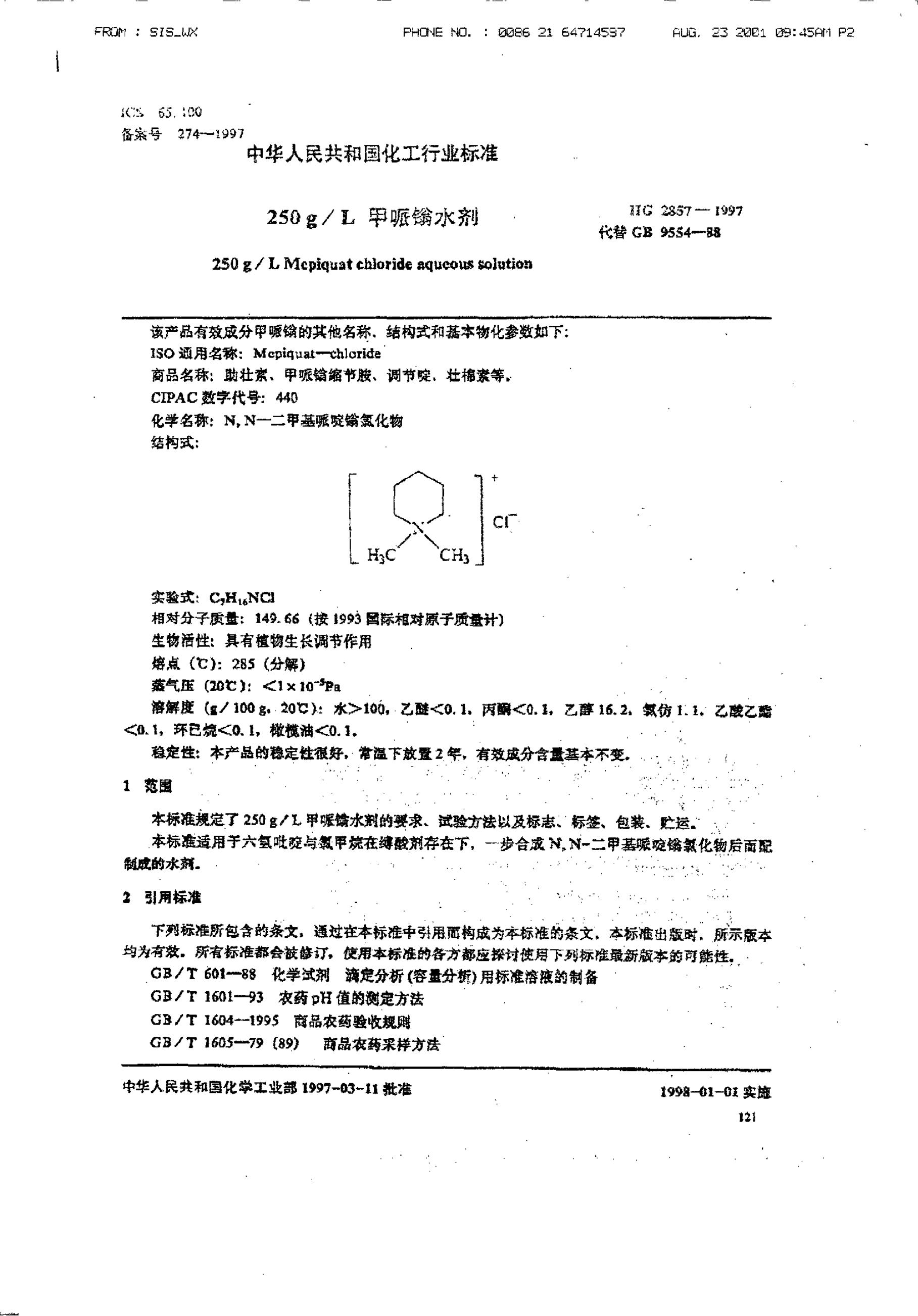 HG/T 2857-1997 250g/L甲哌嗡水剂