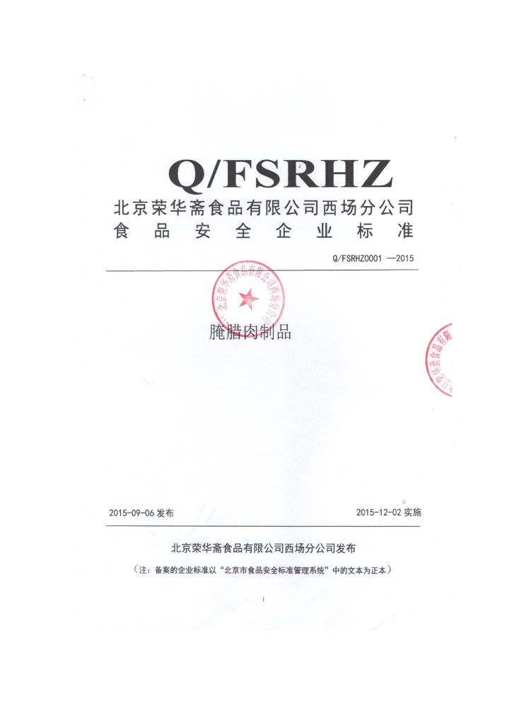 Q/FSRHZ 0001-2015 北京荣华斋食品有限公司西场分公司 腌腊肉制品