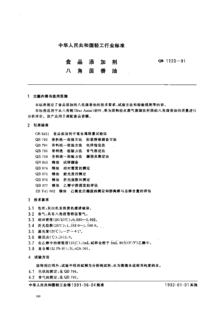 QB/T 1120-1991 食品添加剂 八角茴香油