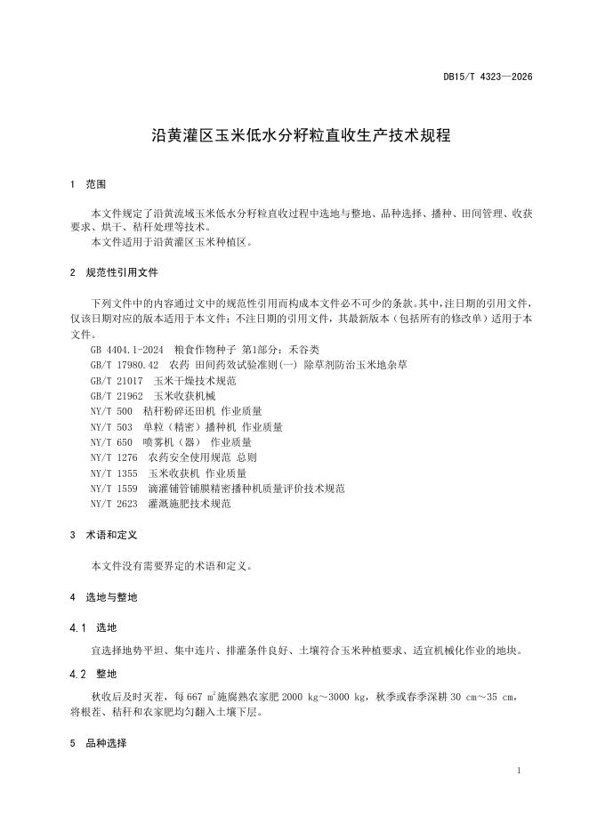 DB15/T 4323-2026 沿黄灌区玉米低水分籽粒直收生产技术规程