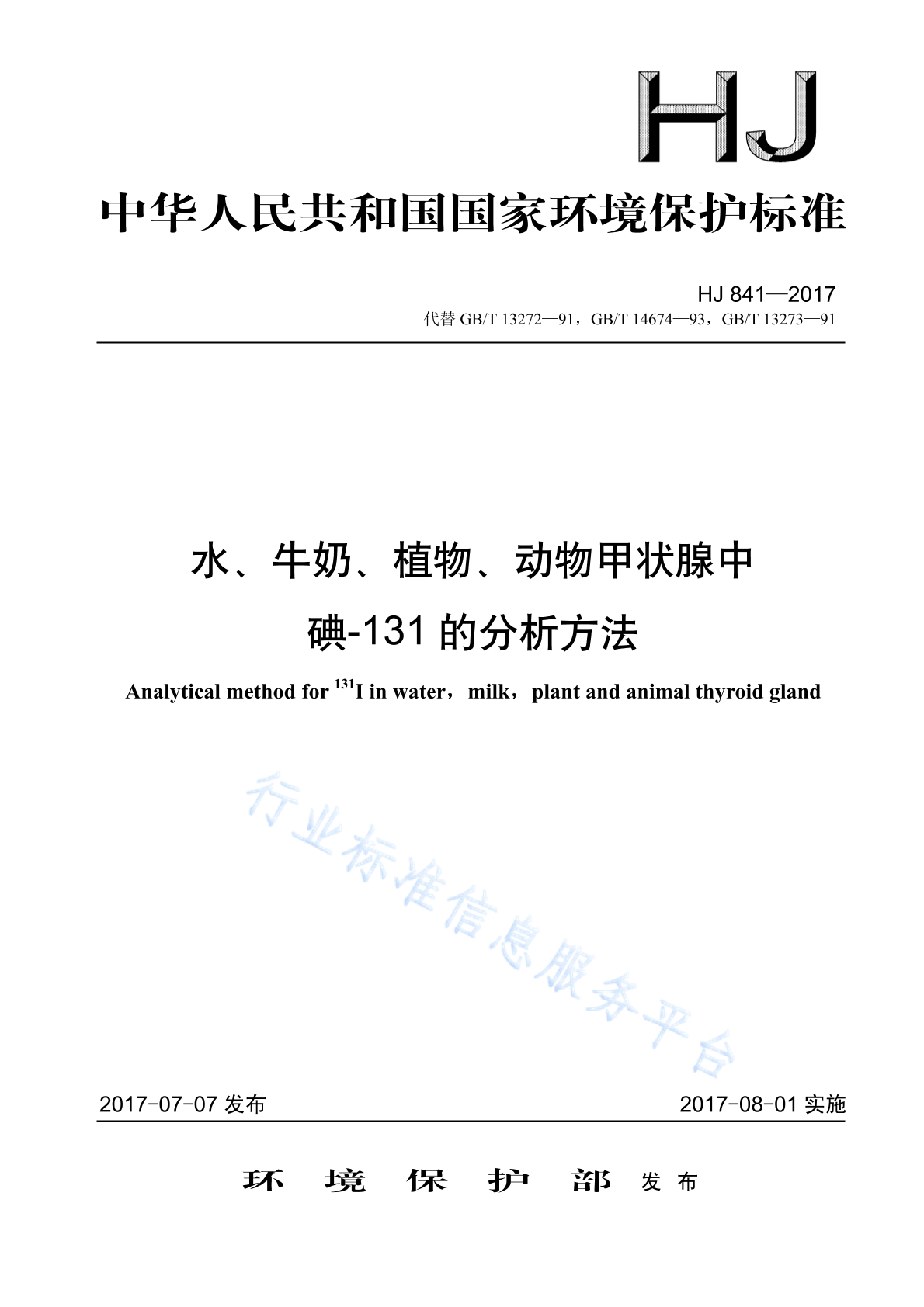 HJ 841-2017 水、牛奶、植物、动物甲状腺中碘-131的分析方法